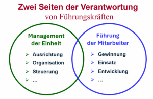 Jede Führungskraft hat zwei Aufgabenkomplexe: Die Personalführung und das Management der zugeordneten Einheit. So ist auch die Verantwortung zu unterscheiden: Mit der eigenen Organisationseinheit die Ziele erreichen und Erfolg haben und dazu die Mitarbeitenden in der direkten Zuständigkeit dazu führen, dass sie an diesen Zielen arbeiten und zum gemeinsamen Erfolg beitragen.